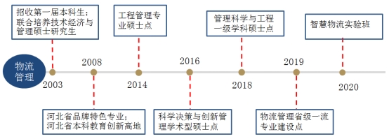 太阳成集团tyc539物流管理专业成立于2002年,为河北省一流建设专业、省级特色专业、河北省本科教育创新高地,是国内最早开办物流管理专业的院校之一。2003年联合培养技术经济与管理硕士研究生,2014年设立工程管理专业硕士点,2016年设立科学决策与创新管理学术型硕士点,2018年设立管理科学与工程一级学科硕士点。2020年本科专业整体升级为“新财经智慧物流”实验班。
