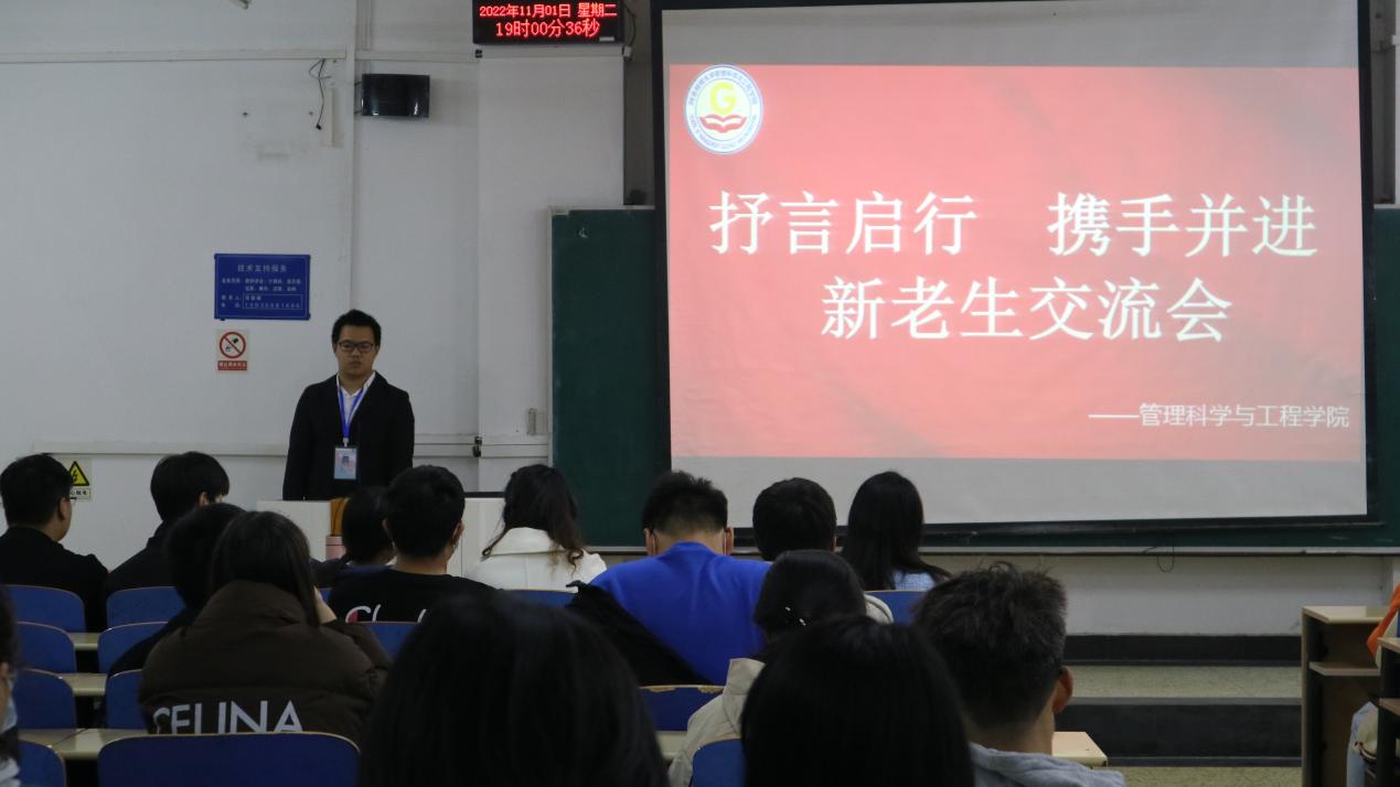 11月1日,公司在三教B101召开以“抒言启行、携手并进”为主题的新老生交流会。2019级信管1班句景怡、2020级信管2班毛泽昀、2020级工程管理1班王媛媛、2020级信管2班李刻欣、2020级工程管理2班齐晓龙受邀参加此次交流会,2022级部分员工代表参加,其他员工通过腾讯会议平台观看。