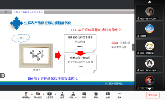 赵林度教授首先介绍了关于智慧供应链的相关概念,重点对智慧供应链所包涵的人工智能、大数据、物联网以及它们之间的相互关系进行介绍。赵教授详细讲解了“互联网+”生鲜农产品供应链优化智能化包括生鲜农产品供应链结构智能优化,功能智能优化和行为智能优化。通过展示集智能化生产、智能化加工、智能化销售于一体的生鲜农产品供应链智能化体系,让与会师生对智能化的生鲜农产品供应链有了更全面与深入的了解。