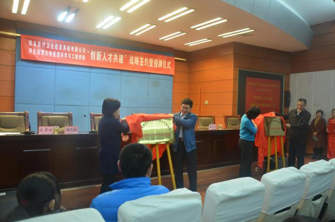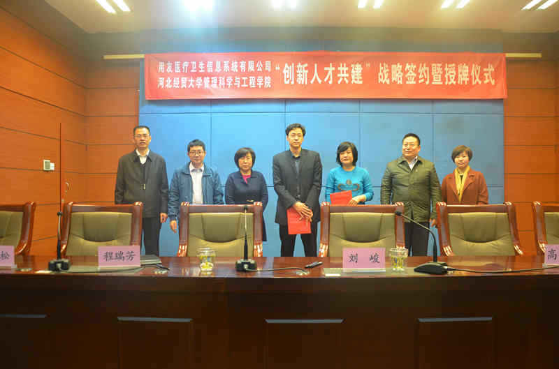 2018年3月12日下午,公司在视频会议室举行“创新人才共建”战略签约暨揭牌仪式。用友医疗卫生信息系统有限公司副总裁刘峻,用友集团人力资源部经理谢庆松,教务处处长程瑞芳教授、副处长孙立威、公司领导班子出席。仪式由公司经理武彦斌主持,公司全体教师及部分员工参加.