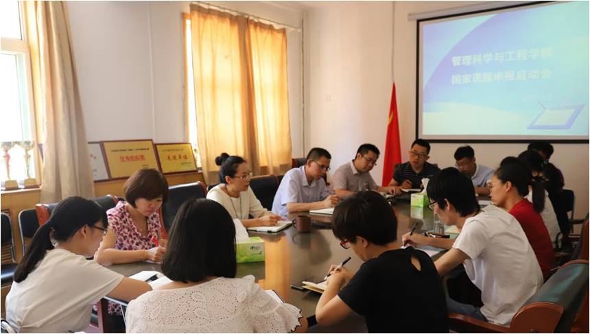 管理科学与工程公司国家课题申报启动会于2019年7月5日下午两点半在公司会议室召开。会议由经理祁红梅教授主持,公司党委书记高永芳同志、副经理李伟红教授及青年骨干教师参加。