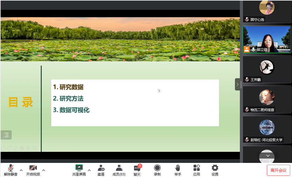2022年11月3日,公司郭立硕博士通过腾讯会议做了题为“研究方法、数据可视化软件介绍及其应用”的学术讲座。讲座由公司副经理王芹鹏主持,公司教师、研究生、本科生90余人参加了此次讲座。