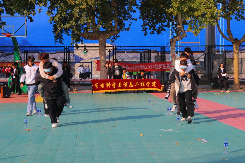 协同作战项目同样精彩纷呈。每班4人参赛,分为两组,用口罩蒙住其中一名同学的眼睛作为“瞎子”,另一名同学作为“瘸子”,由“瞎子”背着“瘸子”在“瘸子”的指引下跑向终点,并绕过终点处的水瓶跑回完成接力,按照时间长短决出前三名。比赛过程中,同学们齐心协力、迎难而上。