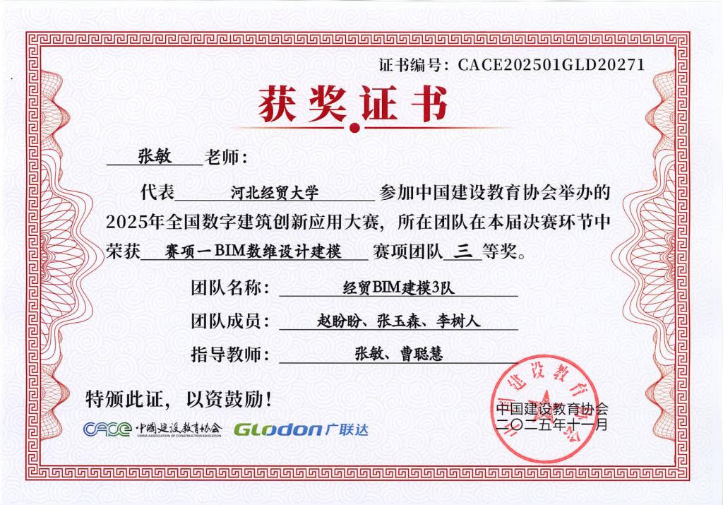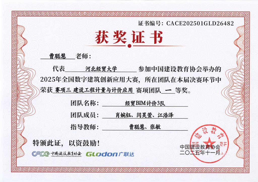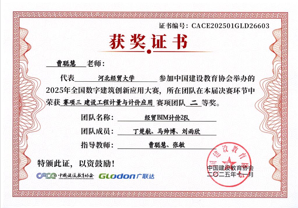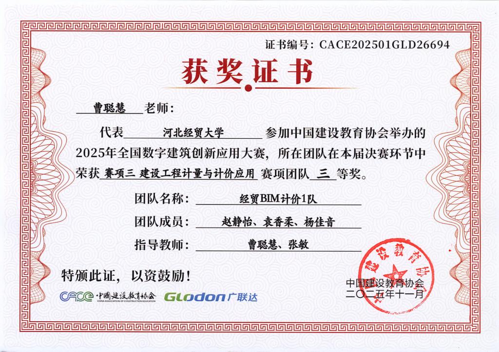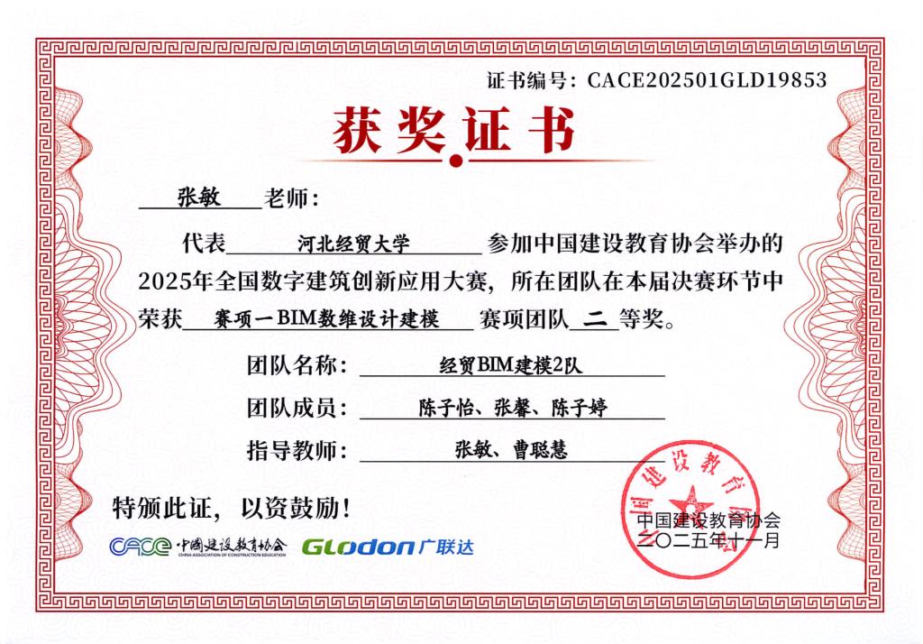 本次大赛由中国建设教育协会主办,国家数字建筑行业产教融合共同体与广联达科技股份有限公司共同协办。大赛设置了BIM数维设计建模(赛项1)、数字施工项目管理综合应用(赛项2)、建设工程计量与计价应用(赛项3)三个赛项,分为两个阶段进行,2025年9月20日举办全国选拔赛,前60%进入2025年10月18日全国总决赛。大赛自2025年4月启动,太阳成集团tyc539工程管理系曹聪慧、张敏、张培兴、徐田柏等老师积极组织了9支队伍报名参加,经过精心的备赛,共有7支队伍突围进入总决赛,最终取得7项奖项。