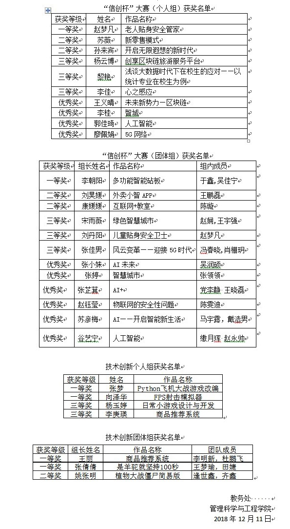 经过历时一个多月的初赛和决赛阶段的现场宣讲、现场投票和网络投票后选出个人组获奖作品一等奖1项,二等奖2项,三等奖3项,优秀奖4项;团体组获奖作品一等奖1项,二等奖2项,三等奖3项,优秀奖6项。今年新设的技术创新个人组获奖作品一等奖2项,三等奖2项;技术创新团体组获奖作品一等奖2项,二等奖1项;其中获奖名单人如下。