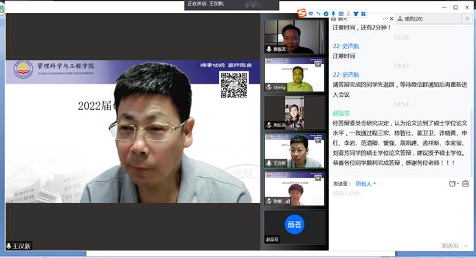 本次答辩会充分发挥线上平台的便利优势,严格遵循公平、公正的原则,经各组答辩委员会表决,35名硕士研究生通过学位论文答辩,1名硕士研究生通过毕业答辩。在确保公司疫情防控期间的研究生答辩工作平稳高效开展的同时,激励同学们从容应对未来学术深造、求职就业等“人生目标问卷”。