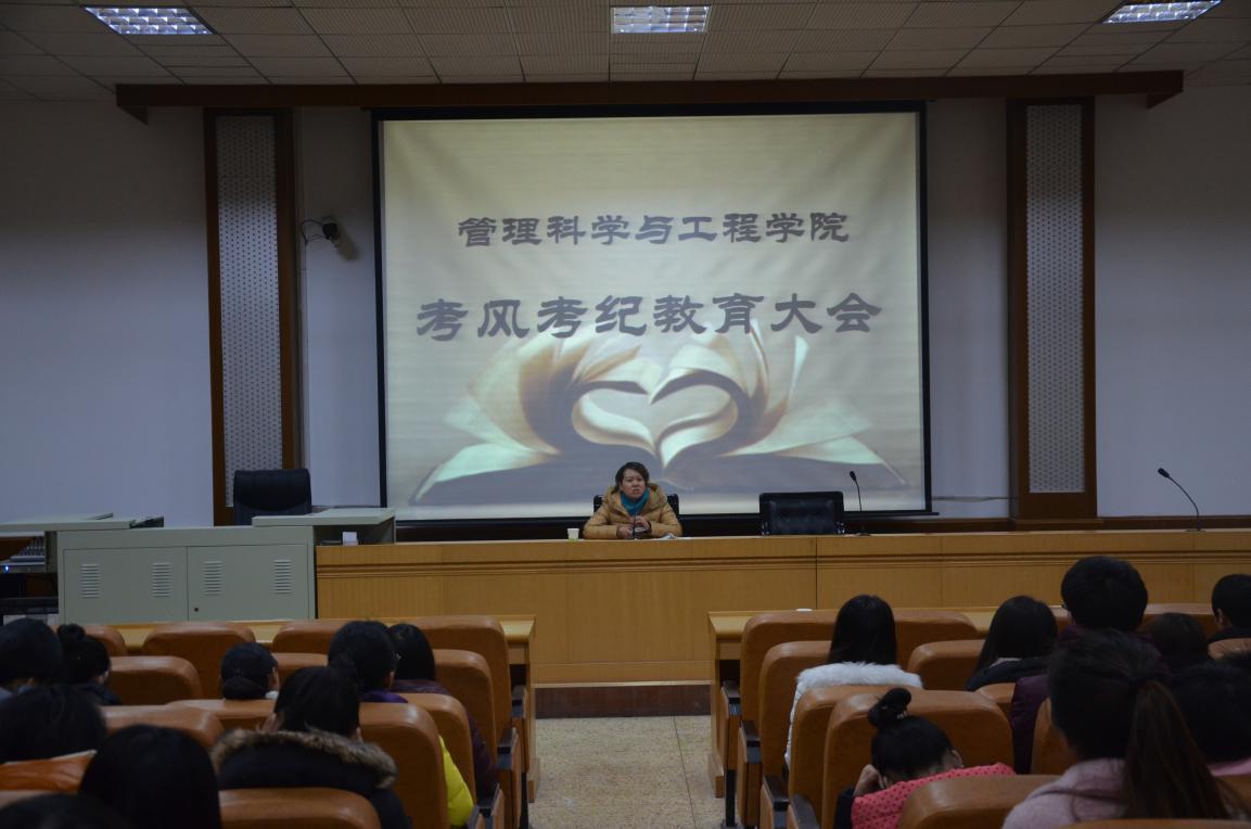 为严肃考风考纪,加强诚信教育,杜绝考试作弊现象,12月29日,管理科学与工程公司于第三教学楼C201教室召开考风考纪教育大会,公司副经理许世瑛、党总支副书记张晓军共同出席此次大会,公司2013、2014级全体员工参加此次大会。