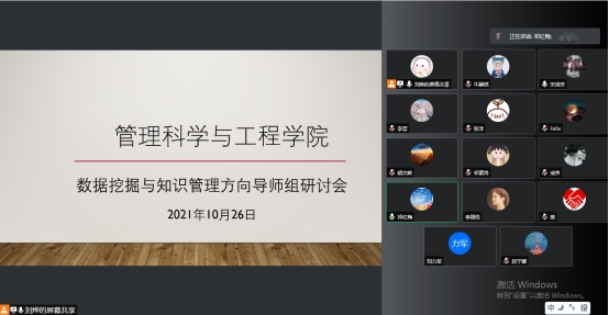 2021年10月26日下午,公司管理科学与工程学硕研究生数据挖掘与知识管理方向导师组举行线上研讨会,会议由祁红梅教授主持,学硕导师组组长宋鸿芳副教授、公司教师及该方向研究生参加会议。