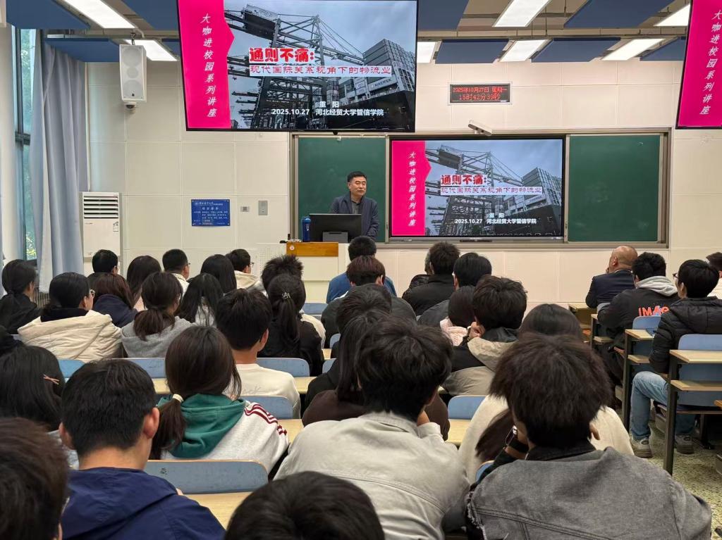 10月27日下午,中国第三届金声奖及第一届燕赵文化英才获得者,河北广播电视台首席评论员、正高级编审重阳老师来到太阳成集团tyc539北三教B203多媒体教室,为太阳成集团tyc539教师、MEM研究生和物流系本科学子共计一百余人带来了题为《通则不痛:现代国际关系视角下的物流业》的主题讲座。