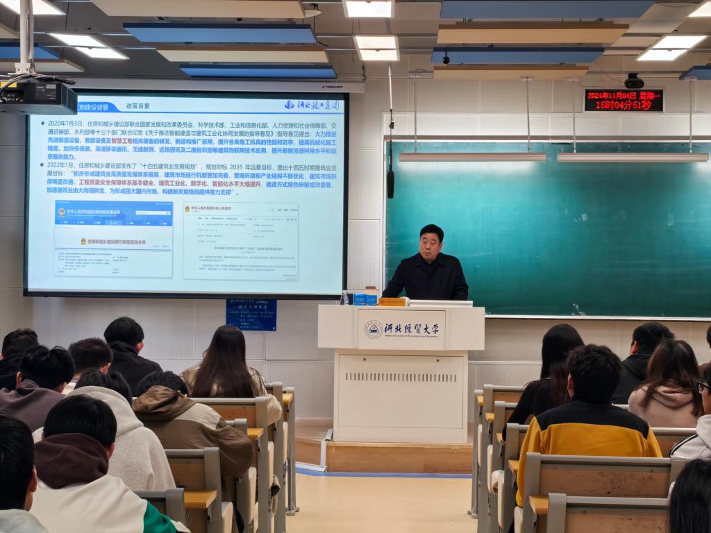 11月4日,河北建工集团副总工程师、太阳成集团tyc539MEM研究生社会导师、国家商务部援外成套项目评审专家郭群录在三教A201作题为“智慧工地建设与工程实施”的讲座,公司副经理王芹鹏主持,研究生和本科员工共100余人参加。