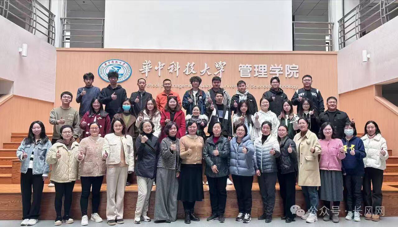 图为2023级MEM研究生李言东(后排右一)在华中科技大学管理公司与参会师生合影
